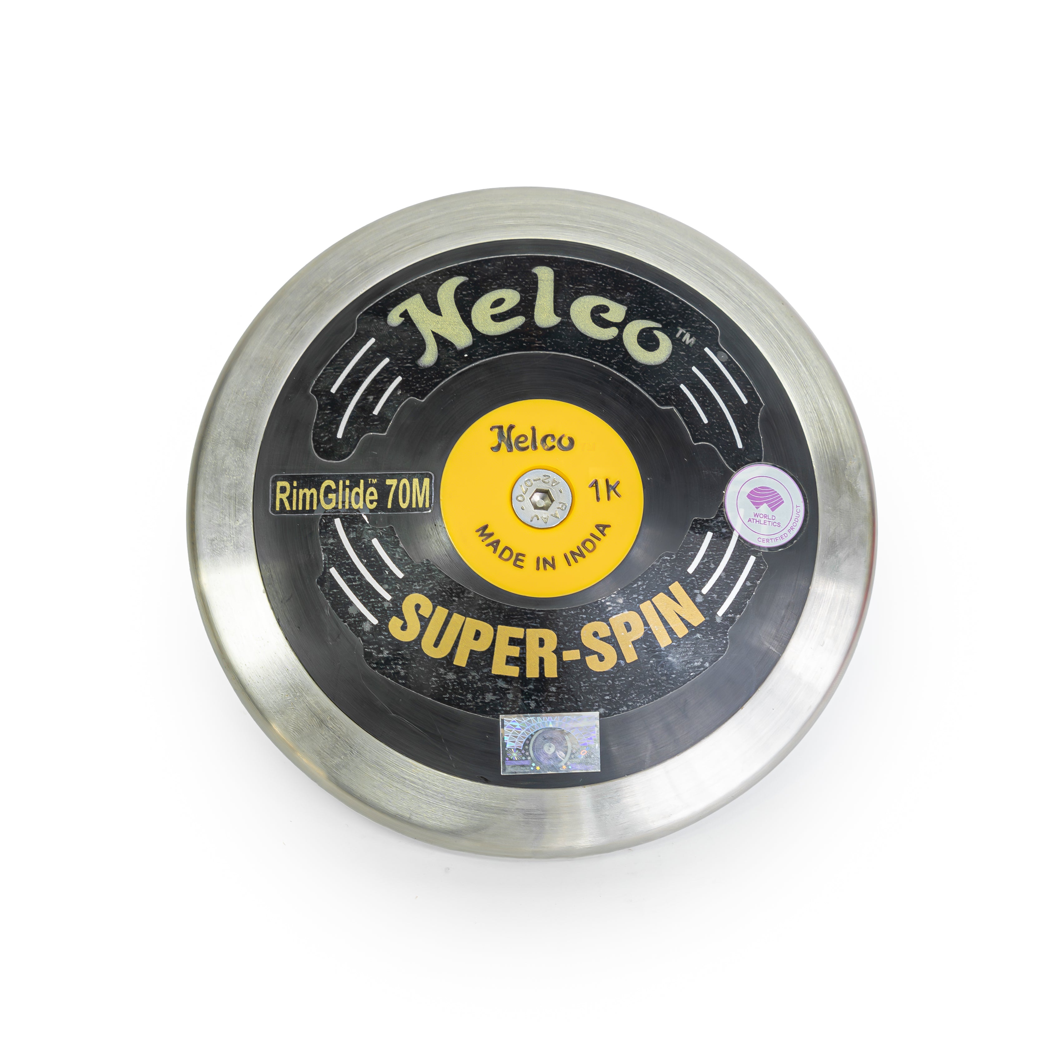 Nelco brand super spin discus with black plastic side plates and metal rim. 70m rim glide. 85% of the weight is distributed around the rim. Supplied with a padded single discus bag.