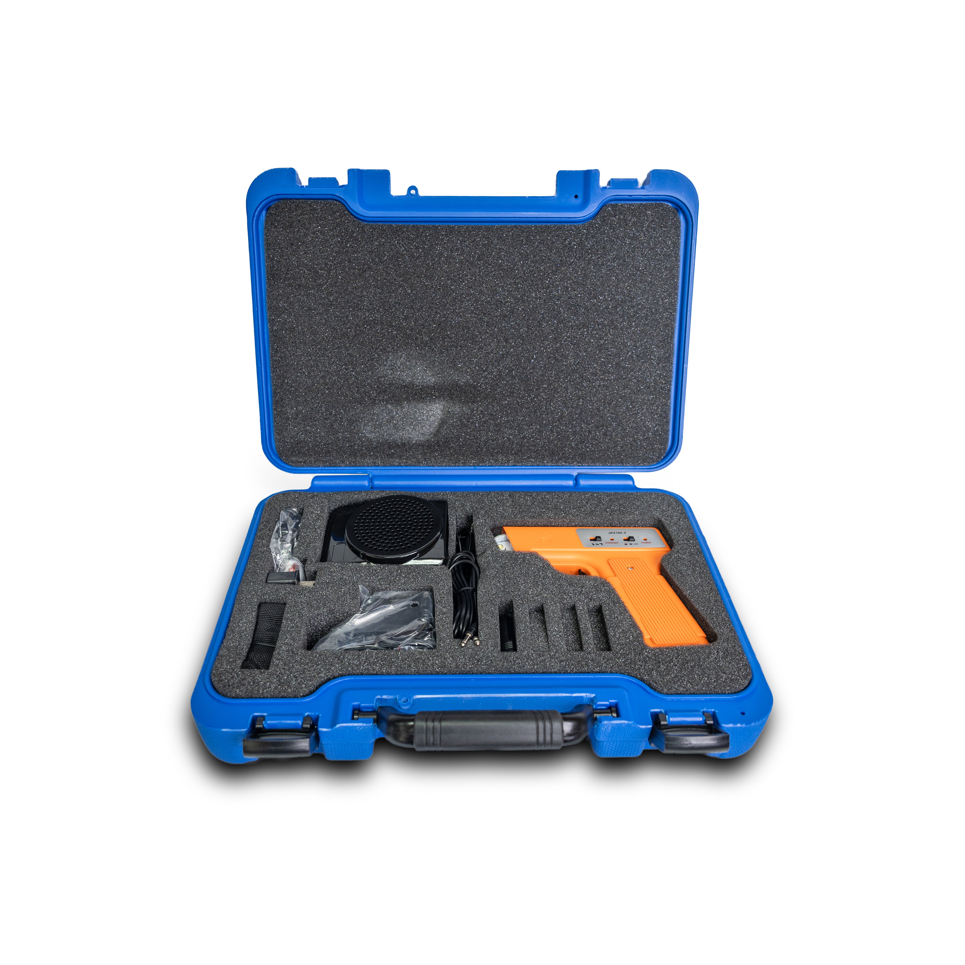 Electronic Jex E Starting Signal provides a clear loud sound, "bang, beep or whistle", and a flash produced by a LED light at the front of the gun. May be modified to work with race clocks and electronic timing systems. Supplied with a waist amplifier and microphone, all contained in a sturdy carry case. The starting signal is powered by 3 AAA batteries. The waist amplifier is rechargeable.