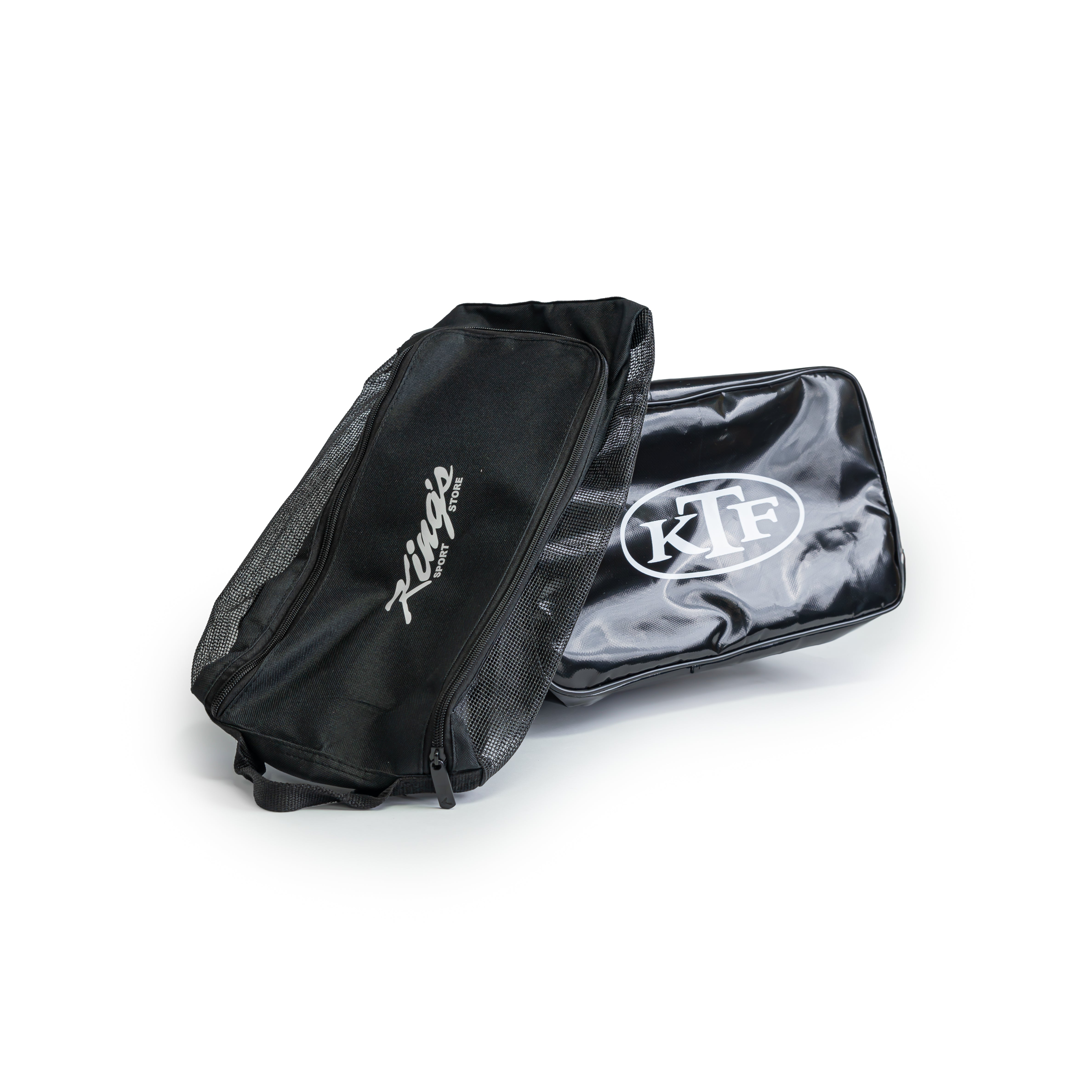 Black shoe bag that will store two pairs of shoes. Breathable mesh with a handle and side zip opening, or sturdy vinyl with a handle and top zip opening.